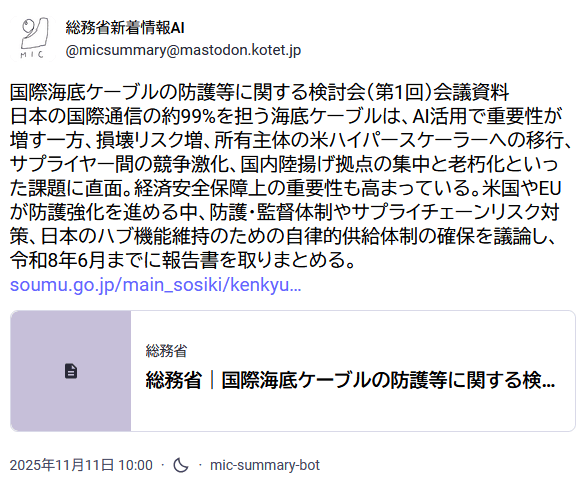この記事では「総務省新着情報AI (@micsummary@mastodon.kotet.jp)」というMastodon Botを作成した経験について書く。 このBotは総務省の新着情報RSSフィードを監視し、新着情報に添付されたPDFを自動で要約してMastodonに投稿するものである。 たとえば以下のような投稿を行う。最近ニュースになっている海底ケーブルに関する会議について要約している。